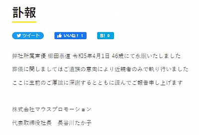 쿠시다 야스미치 (KUSHIDA YASUMICHI)|櫛田泰道 생년월일 1976.06.06 신장 185cm 혈액형 B 소속사 마우스 프로덕션 프로필 [로그] [정보수정] [신규등록] 성우정보 1-https://anidb.net/creator/6081 성우정보 2-https://ja.wikipedia.org/wiki/%E6%AB%9B%E7%94%B0%E6%B3%B0%E9%81%93 새 소식 성우 쿠시다 야스미치씨가 2023년 4월 1일에 돌아가셨다고 합니다.[4]2023-04-10 하얀 모래의 아쿠아톱|2021.07.08 구덴 고우스케 (GUDEN GOUSUKE)|具殿轟介 플라네타리안 ~스노 글로브~|2021.01.20 미카시마 고로 (MIKASHIMA GOROU)|三ケ島吾郎 플라네타리안 ~별의 사람~|2016.09.03 미카시마 고로 (MIKASHIMA GOROU)|三ケ島吾郎 브툼|2012.10.04 곤도 이사미 (KONDOU ISAMU)|近藤 勇 (こんどう いさむ) 30세의 보건 체육|2011.04.07 호시 긴가 (HOSHI GINGA)|星 銀河