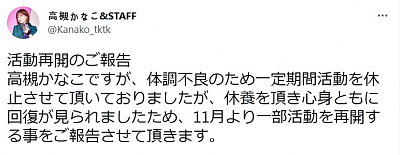 타카츠키 카나코 (TAKATSUKI KANAKO)|高槻かなこ 생년월일 1993.09.25 신장 163cm 혈액형 AB 소속사 아뮤즈 트위터 https://x.com/Kanako_tktk 홈페이지 https://www.instagram.com/kanako.tktk/ 프로필 [로그] [정보수정] [신규등록] 오피셜 웹사이트 : https://kanako-tktk.com/ 성우정보 1-http://anidb.net/perl-bin/animedb.pl?show=creator&creatorid=44276 성우정보 2-https://ja.wikipedia.org/wiki/%E9%AB%98%E6%A7%BB%E3%81%8B%E3%81%AA%E3%81%93 새 소식 성우 타카츠키 카나코, 2024년 12월 28일 자신의 공식 X(트위터)를 통해 결혼 사실 발표[2]2024-12-28성우 타카츠키 카나코의 3rd 싱글 'Before the Nightmare' 재킷 디자인 2종류 공개[1]2022-03-30성우 타카츠키 카나코가 2022년 5월 25일에 3rd 싱글 음반 발매 예정[1]2022-03-04성우 타카츠키 카나코, 2021년 11월부터 단계적으로 활동 재개[1]2021-11-04성우 타카츠키 카나코, 적응장애 치료를 위해 일정 기간 동안 활동을 쉰답니다.[1]2021-08-05 더보기 환일의 요하네 -SUNSHINE in the MIRROR-|2023.06.25 하나마루 (HANAMARU)|ハナマル 블라드 러브|2021.02.14 콘노 카오루 (KONNO KAORU)|紺野カオル 러브 라이브! 선샤인!! (2017)|2017.10.07 쿠니키다 하나마루 (KUNIKIDA HANAMARU)|国木田花丸 사랑과 거짓말|2017.07.04 카토 아야노 (KATOU AYANO)|加藤絢乃 러브 라이브! 선샤인!!|2016.07.02 쿠니키다 하나마루 (KUNIKIDA HANAMARU)|国木田花丸